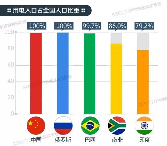 中國和俄羅斯兩國的用電人口已經覆蓋全國總人口的100%了。巴西通電率也接近100%。