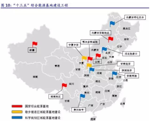“十三五”持續(xù)推進綜合能源基地建設(shè),優(yōu)化能源開發(fā)布局。為促進能源富集地及能源消費地的協(xié)調(diào)可持續(xù)發(fā)展,《能源發(fā)展“十三五”規(guī)劃》明確將綜合能源基地建設(shè)工程作為能源系統(tǒng)優(yōu)化重點工程之一。其一,優(yōu)化建設(shè)山西、鄂爾多斯盆地、內(nèi)蒙古東部地區(qū)、西南地區(qū)和新疆五大國家綜合能源基地。其二,穩(wěn)步推進寧夏寧東、甘肅隴東區(qū)域能源基地開發(fā)。其三,科學(xué)規(guī)劃安徽兩淮、貴州畢節(jié)、陜西延安內(nèi)蒙古呼倫貝爾、河北張家口等區(qū)域能源基地建設(shè)。通過在能源資源富集地區(qū)建設(shè)大型能源基地,并借助外送通道提升能源系統(tǒng)綜合效率。