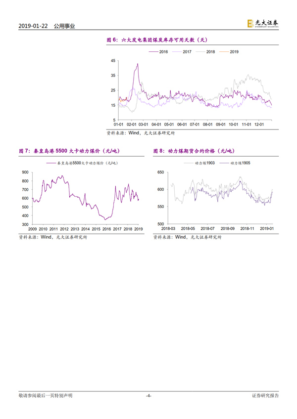 受神木礦難等因素影響,近期動(dòng)力煤現(xiàn)貨、期貨價(jià)格均有所反彈。近期六大發(fā)電集團(tuán)電廠煤炭庫(kù)存仍處高位,疊加2019年一季度用電需求走弱預(yù)期,我們認(rèn)為供給收縮導(dǎo)致的煤價(jià)短期支撐有限。我們認(rèn)為,當(dāng)前階段煤價(jià)(而非利用小時(shí)數(shù))是影響火電盈利的重要因素。隨著2019年長(zhǎng)協(xié)煤價(jià)格控制及市場(chǎng)煤價(jià)中樞回落,火電公司綜合煤價(jià)有望下行,進(jìn)而促進(jìn)盈利修復(fù)。