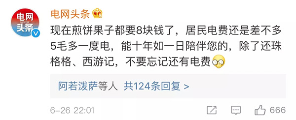與此同時,小新的小伙伴國家電網(wǎng)及南方電網(wǎng)也前來科普。@電網(wǎng)頭條 的回復(fù)是:現(xiàn)在煎餅果子都要8塊錢了,居民電費還是差不多5毛多一度電,能十年如一日陪伴您的,除了還珠格格、西游記,不要忘記還有電費。