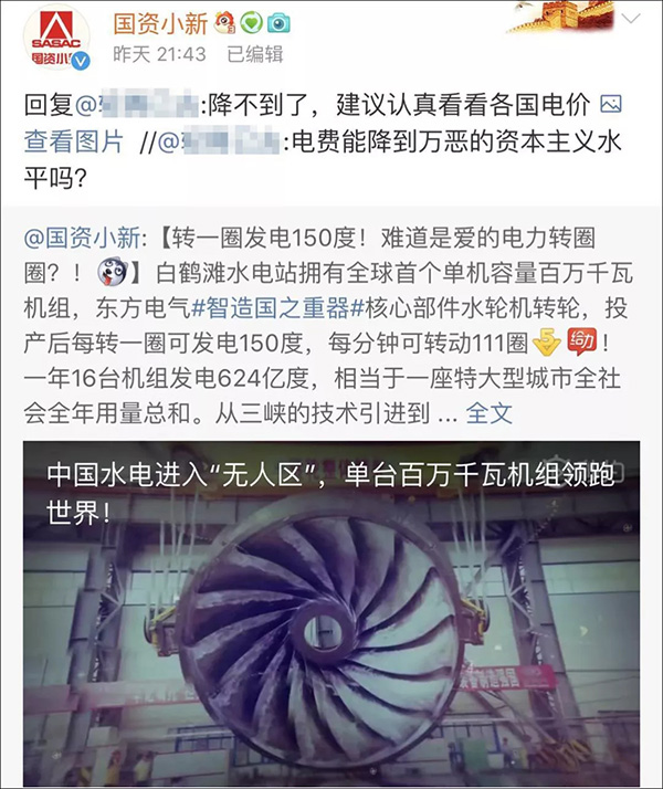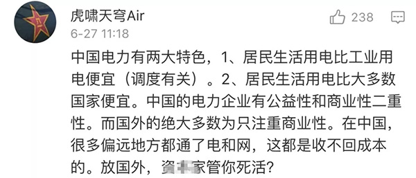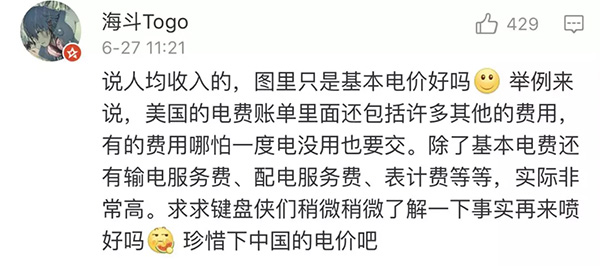 就在網(wǎng)友們紛紛留言點贊時,一位網(wǎng)友在這條微博下留言稱,“電費能降到萬惡的資本主義水平嗎?”