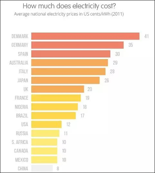 事實上,2011年,英國能源供應(yīng)公司OVO Energy就曾專門對不同國家或地區(qū)的電價進行了相關(guān)調(diào)查,發(fā)現(xiàn)中國的電價維持在一個非常低的水平線: