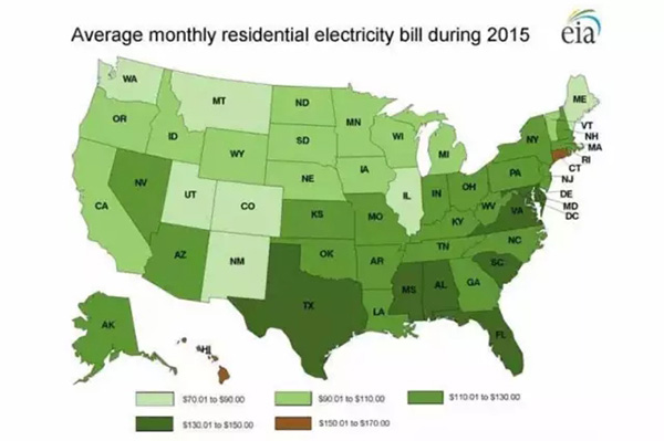 圖片左下角,那塊星星點點的深棕色是美麗的夏威夷,由于夏威夷是孤島電網(wǎng),所以電費非常高,每月平均水平是150~170美元。