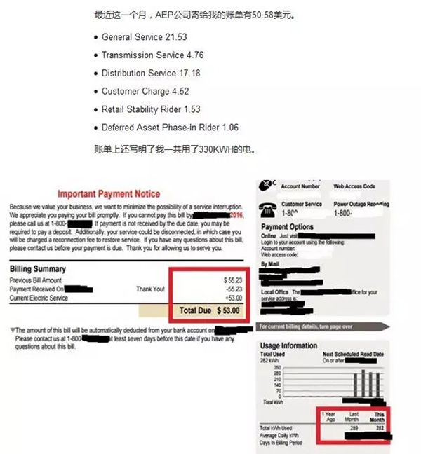這是一位居住在俄亥俄州的網(wǎng)友曬出的電費賬單,他家是一套有兩間臥室的公寓。讓我們來拆解一下賬單。