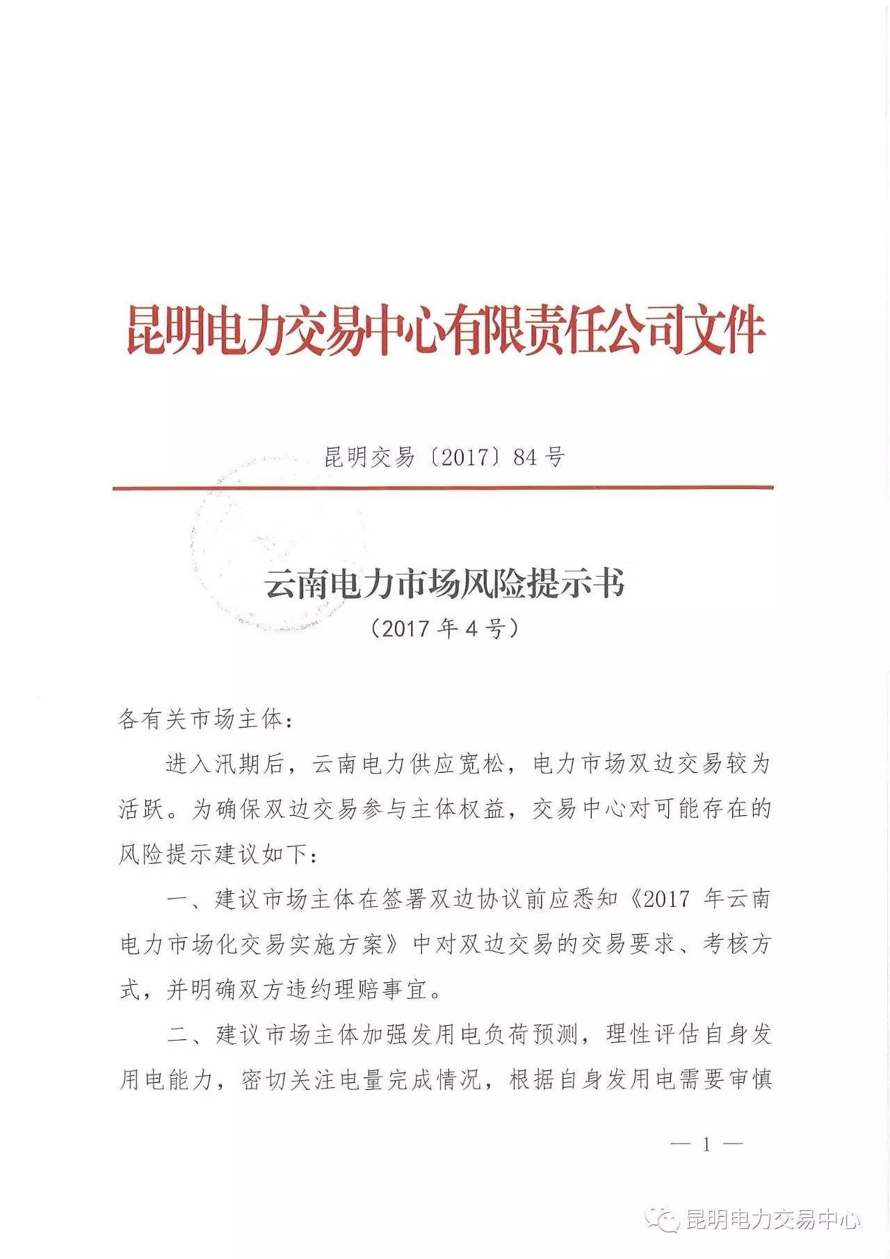 云南電力市場風(fēng)險提示書(2017年4號)發(fā)布