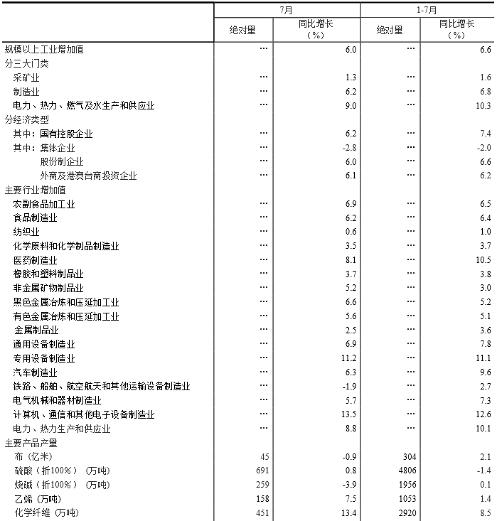 分行業(yè)看,7月份,41個(gè)大類(lèi)行業(yè)中有35個(gè)行業(yè)增加值保持同比增長(zhǎng)。其中,農(nóng)副食品加工業(yè)增長(zhǎng)6.9%,紡織業(yè)增長(zhǎng)0.6%,化學(xué)原料和化學(xué)制品制造業(yè)增長(zhǎng)3.5%,非金屬礦物制品業(yè)增長(zhǎng)5.2%,黑色金屬冶煉和壓延加工業(yè)增長(zhǎng)6.6%,有色金屬冶煉和壓延加工業(yè)增長(zhǎng)5.6%,通用設(shè)備制造業(yè)增長(zhǎng)6.9%,專(zhuān)用設(shè)備制造業(yè)增長(zhǎng)11.2%,汽車(chē)制造業(yè)增長(zhǎng)6.3%,鐵路、船舶、航空航天和其他運(yùn)輸設(shè)備制造業(yè)下降1.9%,電氣機(jī)械和器材制造業(yè)增長(zhǎng)5.7%,計(jì)算機(jī)、通信和其他電子設(shè)備制造業(yè)增長(zhǎng)13.5%,電力、熱力生產(chǎn)和供應(yīng)業(yè)增長(zhǎng)8.8%。