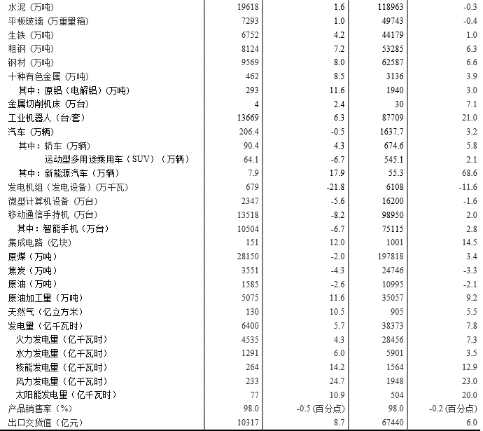 分產(chǎn)品看,7月份,596種產(chǎn)品中有345種產(chǎn)品同比增長(zhǎng)。其中,鋼材9569萬(wàn)噸,同比增長(zhǎng)8.0%;水泥19618萬(wàn)噸,增長(zhǎng)1.6%;十種有色金屬462萬(wàn)噸,增長(zhǎng)8.5%;乙烯158萬(wàn)噸,增長(zhǎng)7.5%;汽車(chē)206.4萬(wàn)輛,下降0.5%;轎車(chē)90.4萬(wàn)輛,增長(zhǎng)4.3%;發(fā)電量6400億千瓦時(shí),增長(zhǎng)5.7%;原油加工量5075萬(wàn)噸,增長(zhǎng)11.6%。