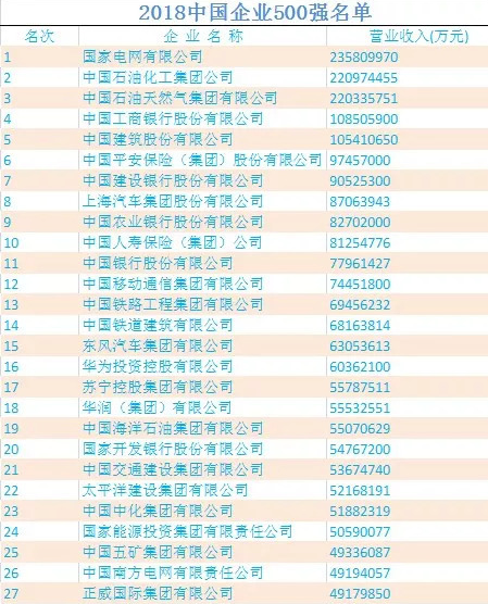 9月2日,中國企業(yè)聯(lián)合會、中國企業(yè)家協(xié)會發(fā)布“2018中國企業(yè)500強”排行榜,國家電網、中國石化和中國石油營業(yè)收入穩(wěn)居前三位。民企入圍數量增加占據近半壁江山,其中金融業(yè)最賺錢。