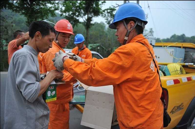 圖1:搶修人員向災民發(fā)放燈泡。 圖2、3:搶修人員點亮紅星村銅鼓組安置點?! ?月21日,為了給四川省蘆山縣龍門鄉(xiāng)各重要臨時安置點送電,電力搶修人員爭分奪秒地穿梭在沿途各安置點上,用責任與汗水為受災