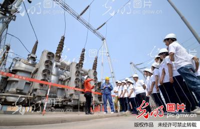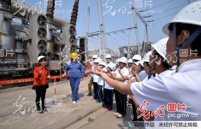 2014年4月22日,在河北省邯鄲市供電公司來馬220kV變電站,工作人員為聾啞學生講解電力知識。4月22日,河北省邯鄲市特殊教育學校的聾啞學生們走進邯鄲市供電公司電力科普園、職工技術創(chuàng)新成果展示室、來馬220kV變
