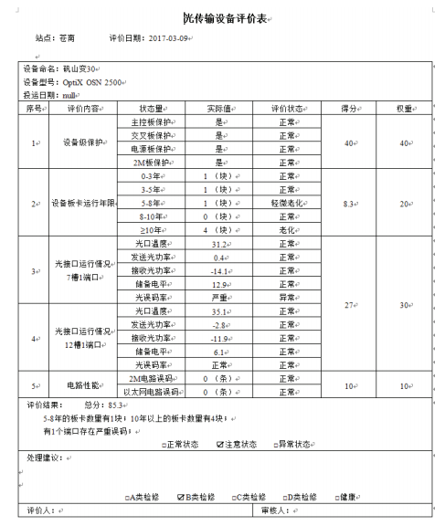 根據(jù)狀態(tài)評價體系自動生成光傳輸設(shè)備評價表,可作為該設(shè)備的體檢報告。光傳輸設(shè)備評價報告如