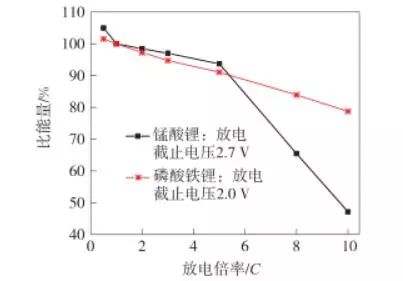在能量密度方面,錳酸鋰和磷酸鐵鋰一直以來不相上下,克容量上磷酸鐵鋰會高一些,但是電壓較低,兩相抵消基本打平,不過,由于錳酸鋰的壓實密度明顯高于磷酸鐵鋰,就體積比能量來看錳酸鋰還是遠高于磷酸鐵鋰的。另外,磷酸鐵鋰在高倍率放電時能量密度損失較小,性能明顯優(yōu)于錳酸鋰。