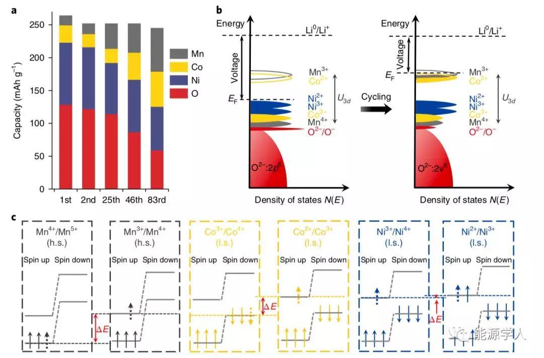 圖3.Li1.2Ni0.15Co0.1Mn0.55O2氧化還原的演變過程。(a)不同循環(huán)圈數(shù)下每種元素的對放電容量的貢獻(xiàn),(b)由于電子結(jié)構(gòu)變化導(dǎo)致費(fèi)米能級升高的佐證(c)對于不同的氧化還原電對,Mn和Co將涉及不同的能級。