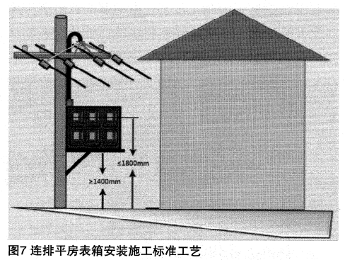 多層住宅表箱安裝工藝,連排平房表箱安裝工藝,桿上表箱安裝和變臺計量箱安裝工藝。連排平房表箱安裝施工標準工藝如圖7所示。